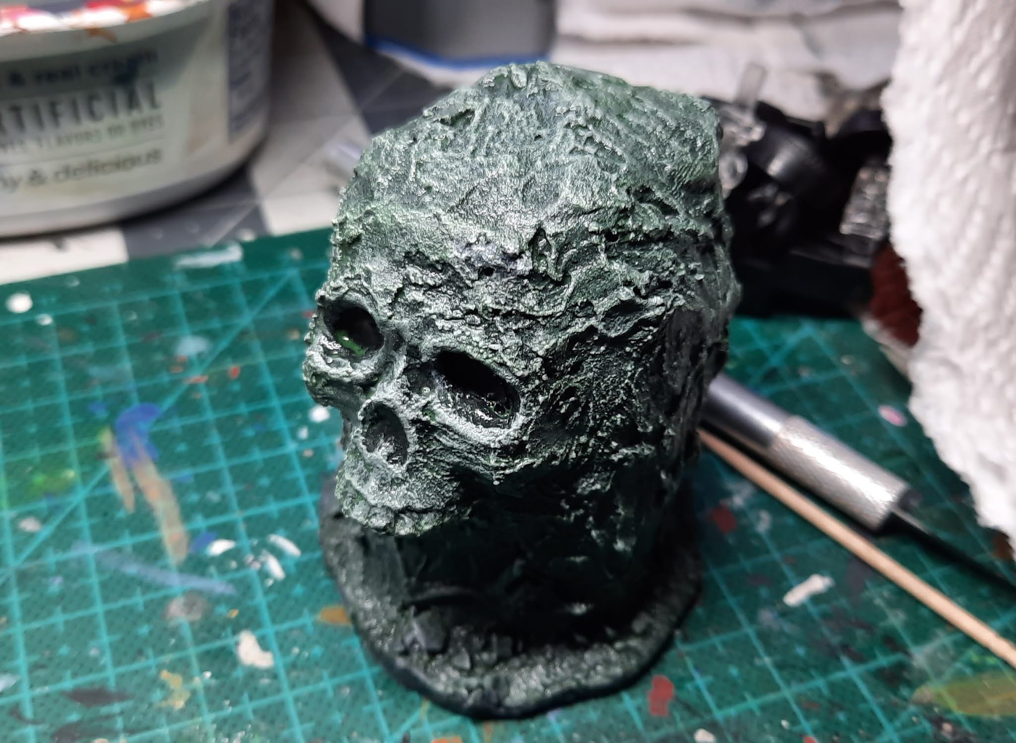 Painting time! I wanted to do this one more rock-like than my ruined chapel so I stuck to greys — Dark, Somber, Neutral, Ash and Silvergrey, to be precise. Somber was binned as it's too blue. This pic is before I used the lighter greys and a touch of Off-White. You can still see the Somber Grey under the skull's eye on the left.